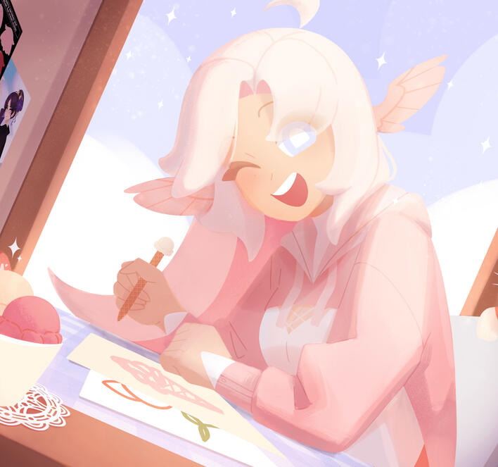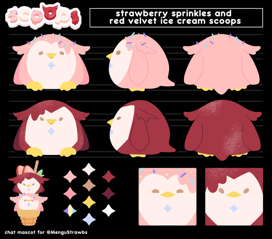 Hello hello!! I’m Mengu Strawbs, but you can just call me Mengu! I’m a sweet little strawberry ice cream penguin who loves creating art and playing all kinds of games. When I'm not busy with art commissions, I’m off on fun adventures, diving into a variety of games! I’m super excited to share this journey with you all, let’s have an amazing time together Scoops! Just so you know, I go by she/her and I’m happily in a relationship with Mogi!